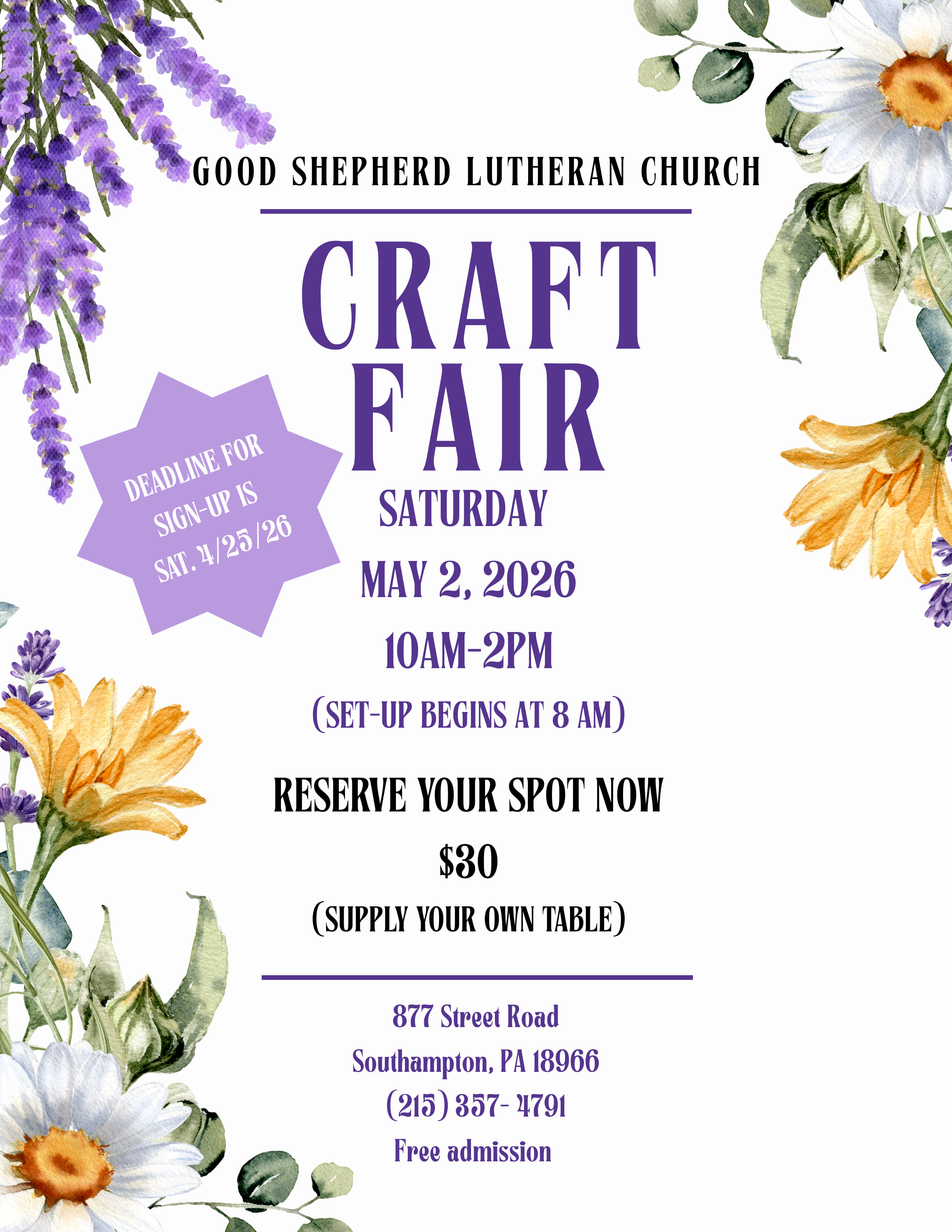 GSLC Craft Fair Saturday, May 2, 2026 10:00 AM 2:00 PM Good Shepherd Lutheran Church 877 Street Road Southampton, PA 18966 United States (map) Google Calendar ICS Register CALL (215) 357-4791EMAIL TRACY or MIRANDA FOR ADDITIONAL INFORMATION